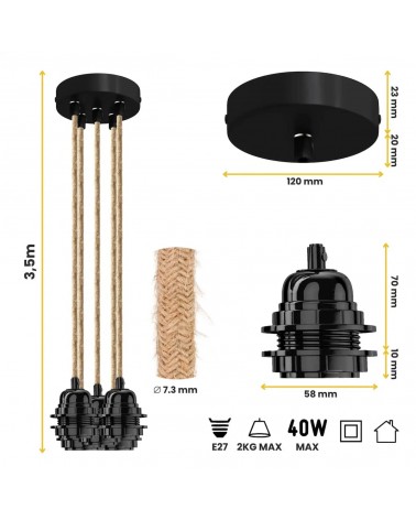 Modell: HANG-5 Leinen - Hängelampe, Pendelleuchte 5 flammig, Deckenlampe, bestehend aus fünf 3,5 m langen Textilkabel mit Fassung und Deckenrosette.