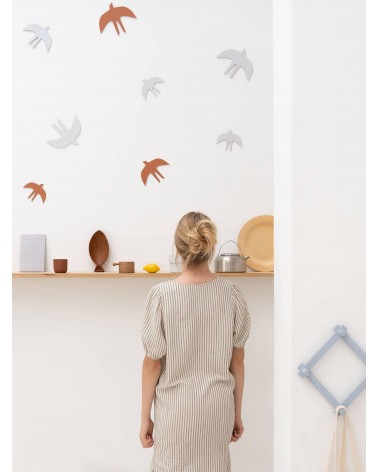 Ce set de 3 oiseaux en papier écologique FSC se fixe directement sur le mur pour créer une composition légère et aérienne.