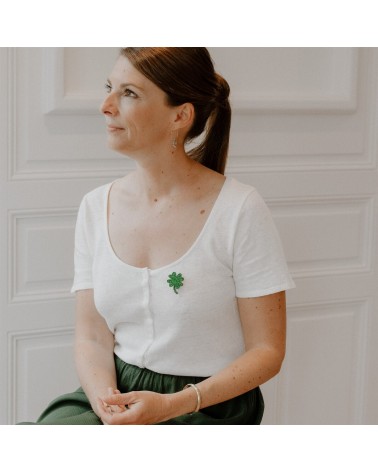 Aggiungi un tocco di colore al tuo outfit con questa graziosa spilla a forma di quadrifoglio portafortuna in feltro glitterato, disegnata e realizzata in Francia!